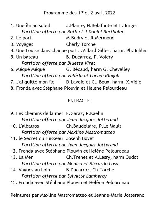 Accompagnement: Teresa Trachsel au piano et le groupe Fronda: Hélène Pelourdeau à la voix et Stéphane Plouvin à l'accordéon